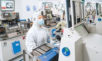 11月3日,正在江苏南通如东经济开辟区的南通宁芯微电子无限公司,工做人员正在拆片焊线车间内功课。记者 李 博摄。