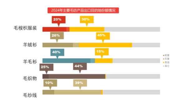 毛纺两头产物取毛纺最终产物的出口目标地环境差别也较大。对东盟的毛纱线和毛织物出口占这两类产物出口的份额已接近或跨越40%,欧盟虽然仍是毛纱线和毛织物的主要出口市场,但别离呈现下滑,2024年,毛织物对欧盟出口额也下跌了17。9%。羊毛衫、羊绒衫及毛梭织服拆的出口市场仍是美国和欧盟,三类产物对这两个市场的出口额均呈现增加。