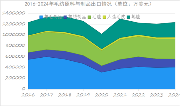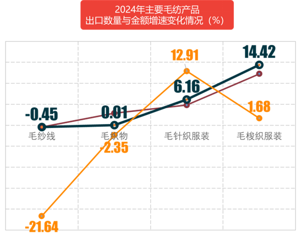毛纺制成品的出口形势好于毛纺两头产物。2024年,毛纱线和毛织物出口数量根基持平或小幅下跌,出口金额则呈现下滑,而毛针织服拆和毛梭织服拆出口数量同比别离增加6。2%和14。4%,出口金额也同样增加,增速别离为12。9%和1。9%。